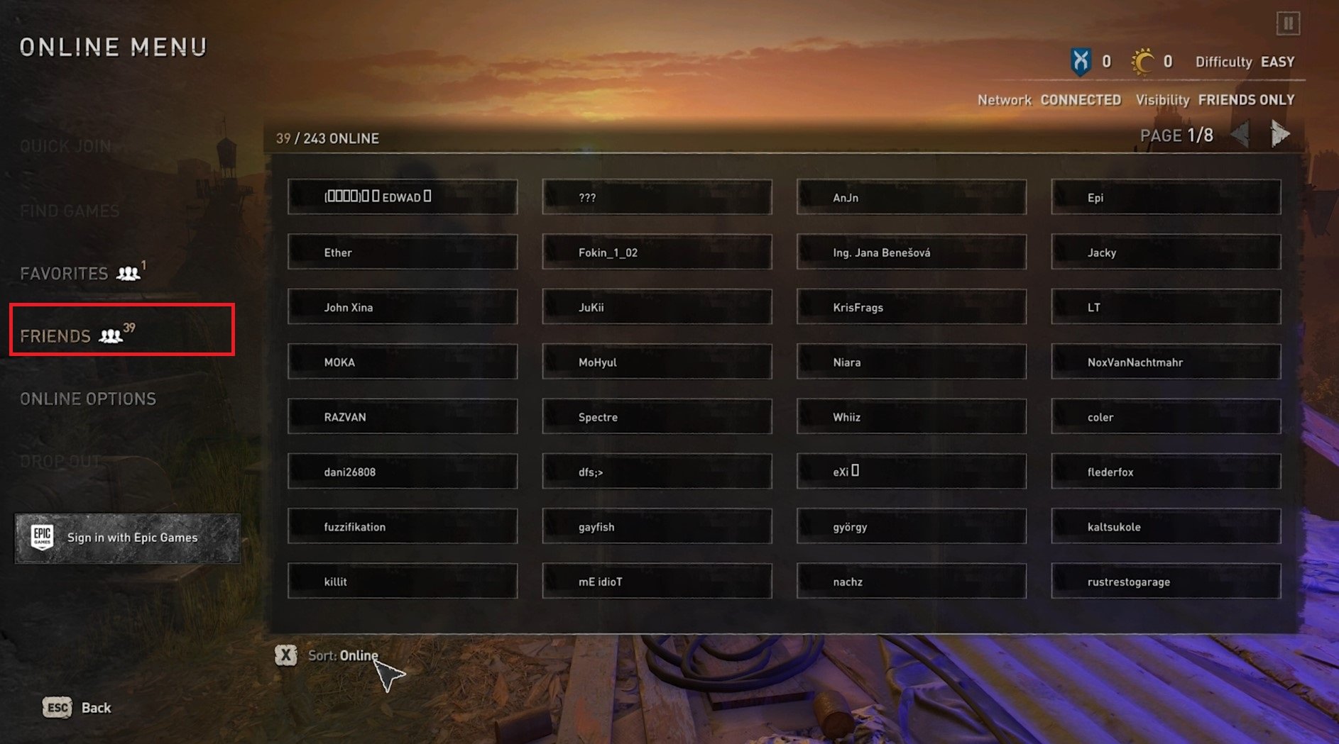 In the Friends tab, you can view your online friends among those offline. You can scroll through the friend’s pages on the top right, and below, you can sort your list by default, showing your online friends first, by name, player rank, or be in distress. To add a friend to your game, ensure your game type is set to Public or Friends Only. After logging in with your account, you can add a player from your friend’s list.