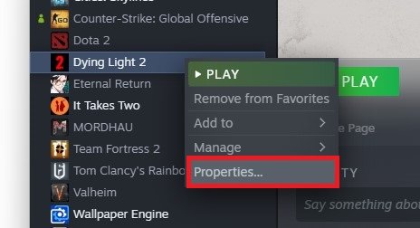 Close Dying Light 2 and open up your Steam library. Right-click Dying Light 2 and select Properties.