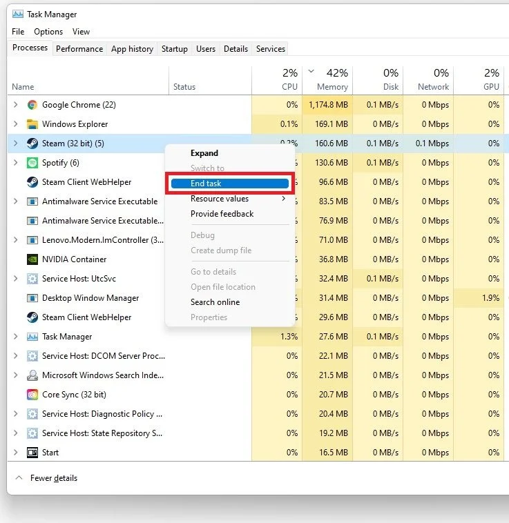 Open up your Task Manager by searching for it in your start menu search. In the Processes tab, make sure to end the programs from running in the background, which could show an overlay while in-game. In my case, that would be Steam, GeForce Experience, or Discord. You should end CPU-intensive processes, such as Shadowplay and Adobe Applications, but make sure to only end the processes from running that you know won’t break your operating system.