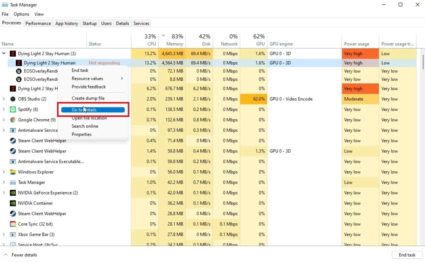 Task Manager > Processes > Dying Light 2 > Go to details