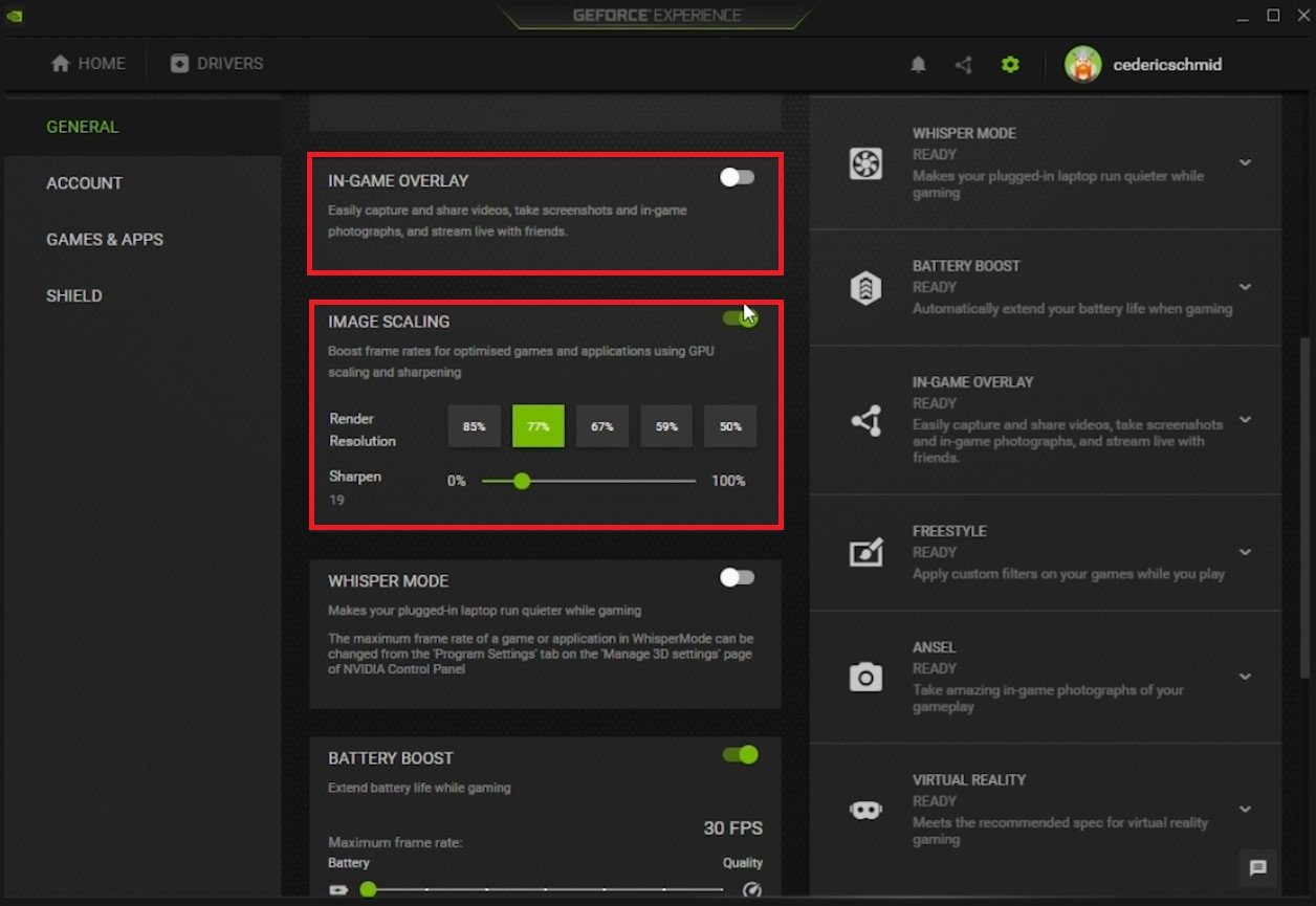 When navigating to your GeForce settings, disable the In-Game Overlay in your General settings tab, as application overlays often cause performance issues. Below, you have the option to enable the Image Scaling option. For some of you, this option is unavailable as your graphics driver is not current. Enabling NVIDIA Image Scaling can dramatically increase your frame rate for any game you play on your PC.