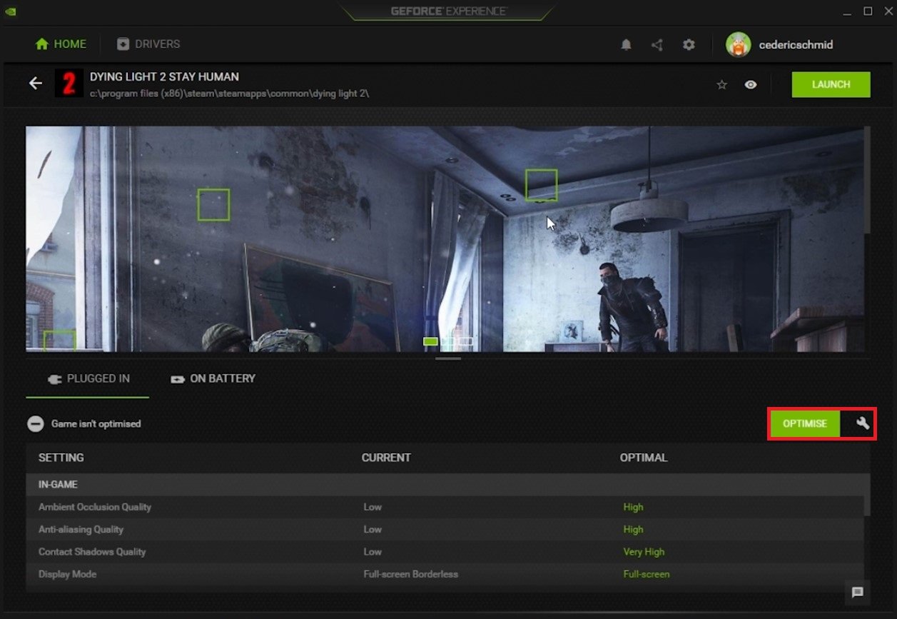In the Home tab, you can access individual game settings, which can also be changed from here. Select Details for Dying Light 2. Depending on your hardware, you will be presented with current in-game settings and the optimal settings suggestion. When selecting Optimise, GeForce Experience will apply the recommended settings to the game. You also have the option to use custom settings when selecting the wrench icon. Use this slider system to reduce some options and change your display resolution and display mode.