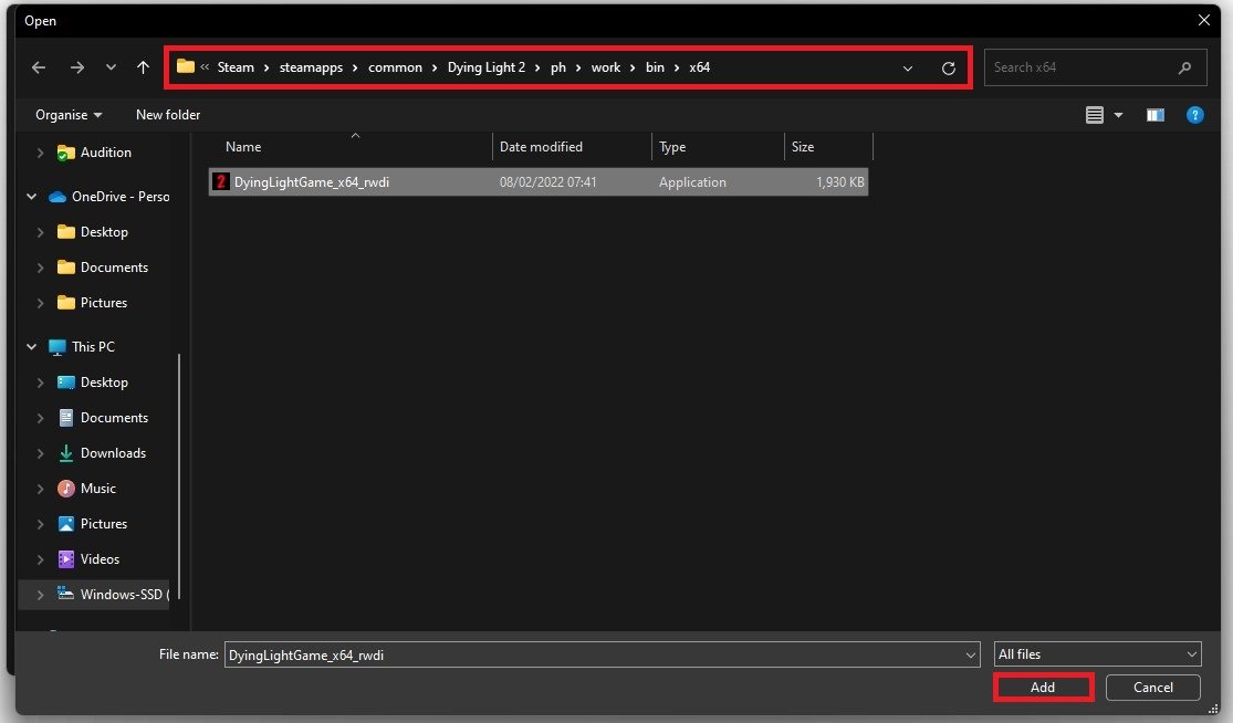 In your File Explorer, navigate to the drive on which you saved the game on. The file path for the Steam version is: Program Files > Steam > steamapps > common > Dying Light 2 > ph > work > bin > x64 and here select DyingLightGame.