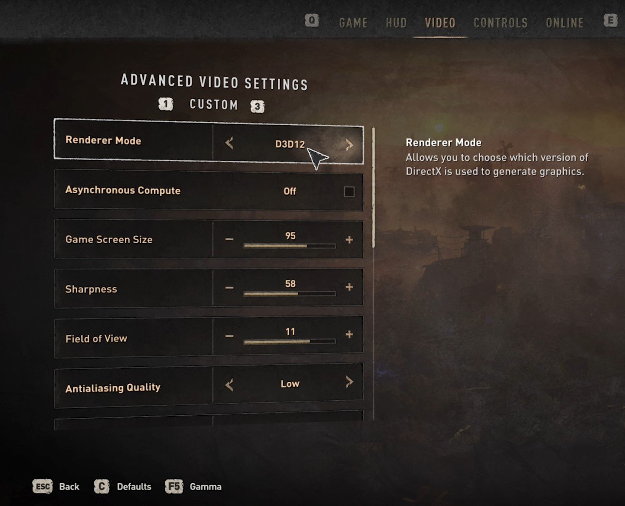 Navigate to your Advanced Video Settings using the F key. Use DirectX 12 as the Renderer Mode instead of DirectX 11 in case it’s available to you. Otherwise, use DirectX 11. Increase the Sharpness option, set to 45 by default, to around 50-60. This will also depend on which resolution you are playing.