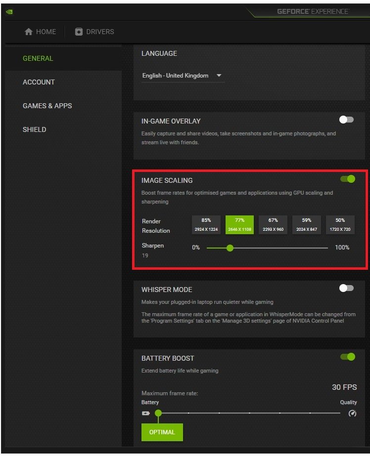 GeForce Experience > General Settings > Image Scaling