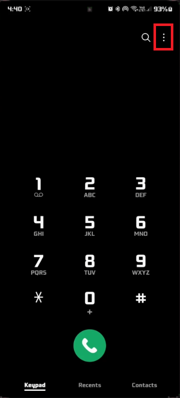 Start by launching the Phone app on your Android smartphone. Once there, you'll see three vertical dots, often referred to as the "More Options" icon, situated in the upper-right corner of your screen.