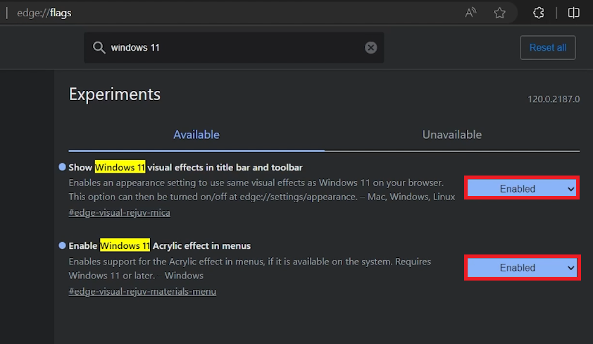 edge://flagsand press 'Enter' to land on the Experiments page.Use the search bar atop to seek “Windows 11.” Two options will parade in the search results.