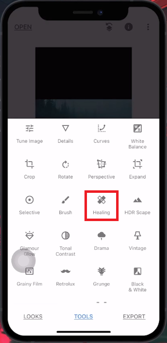 In Snapseed, you'll see options like 'Looks', 'Tools', and 'Export'.