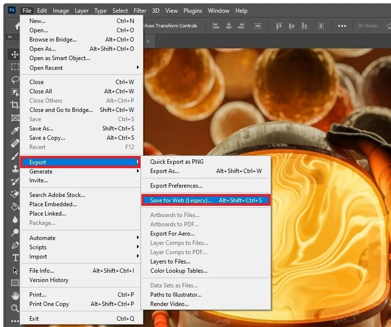 After editing your Photoshop image, navigate to File, and under Export, click on Save for Web (Legacy).