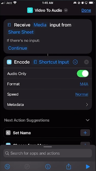 Tap 'Done' to complete the setup, and your new 'Video to Audio' shortcut is now ready for use.