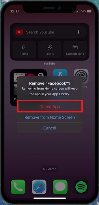 Remove the Facebook App: Press and hold the Facebook app icon on your home screen. When the options appear, select “Remove App” and then confirm by tapping “Delete App.”