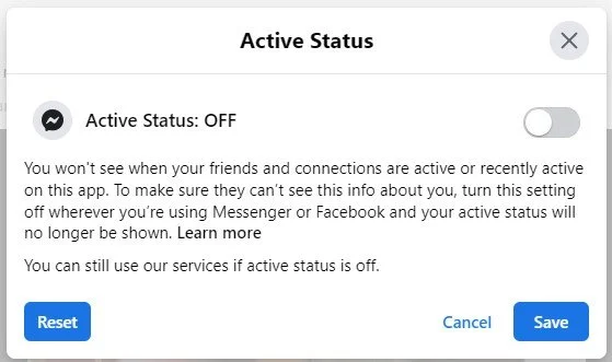 Select it, which will open this pop-up menu. You have the option to set your Active Status to OFF, which will make you appear offline for all friends and connections that can see your active or recently active status in Messenger.