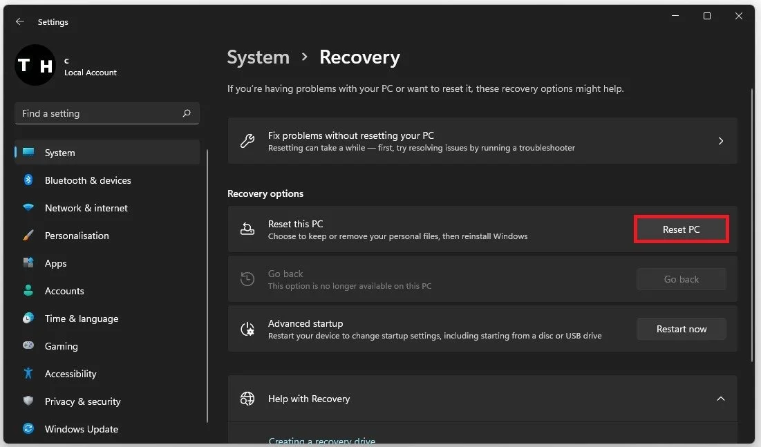 Reset your PC through the Windows Settings
