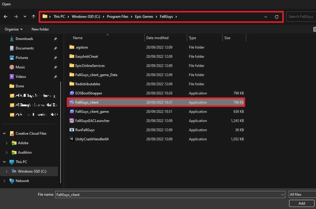 Here, navigate to the drive on which you save Steam or Epic Games. The default install location for Fall Guys is under Program Files > Epic Games > Fall Guys. Make sure to select the Fall Guys client application and click on Add.