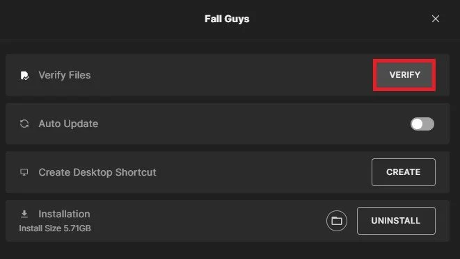 On this new window, click on Verify. This will take a minute to redownload and replace any missing or corrupted game files. This will also make sure that Fall Guys is up to date.