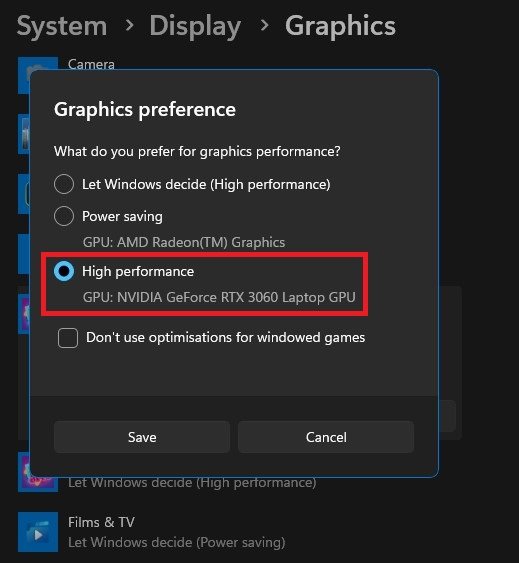After adding Fall Guys to this application list, proceed to its Options. Here, ensure that the Graphics preference is set to High performance before saving your changes.