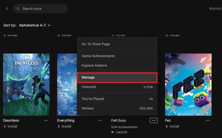 First, you should ensure that your Fall Guys files are up-to-date and complete. In your Epic Games launcher, navigate to your game library. Click on the burger menu icon for Fall Guys and select Manage.