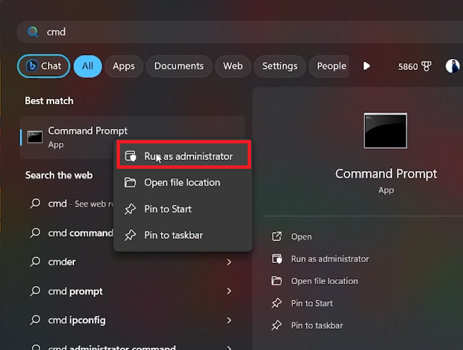 Right-click on the 'Command Prompt' application that appears and select 'Run as administrator' to grant necessary permissions.