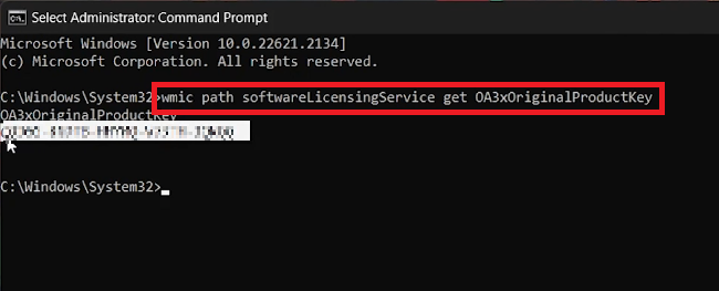 In the newly opened window, input the following command to fetch your license key: wmic path softwareLicensingService get OA3xOriginalProductKey