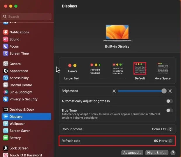 For Mac OS Ventura and later, navigate to the Displays section. This will allow you to preview your connected external monitor and/or your built-in laptop screen for MacBook Air and MacBook Pro users. Here, you can, first of all, change your display resolution by switching between these settings. The default option should work best as it will use the native display resolution.