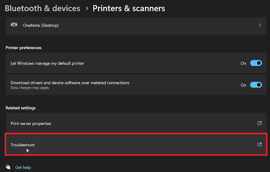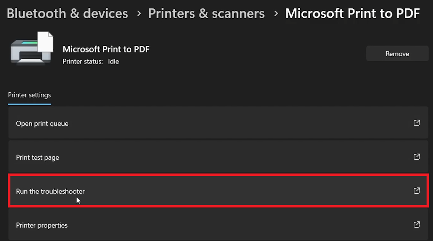 Navigate to the 'Printers and Scanners' section, where you'll find the 'Troubleshoot' button. Clicking this will initiate a diagnostic scan aimed at identifying and rectifying any common printing or scanning issues you might be facing.