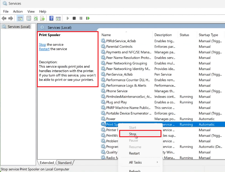 The Print Spooler is a software program responsible for managing print jobs on your computer. You can restart it via Windows Services Manager by searching for 'Services' in the Start menu. Locate "Print Spooler," right-click, and select 'Restart.’