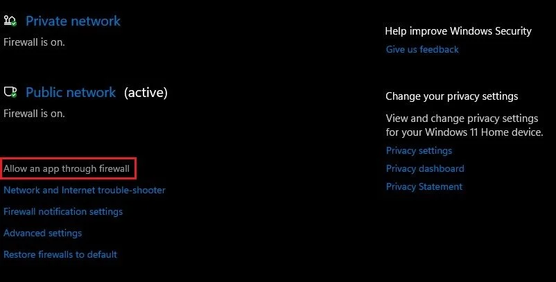 If Roblox is not launching properly, or if you are getting the error 268 after loading into an experience, then make sure to close Roblox and search for Firewall in your start menu search. This will open your Firewall & Network Protection system settings window. Here, select Allow an app through Firewall.