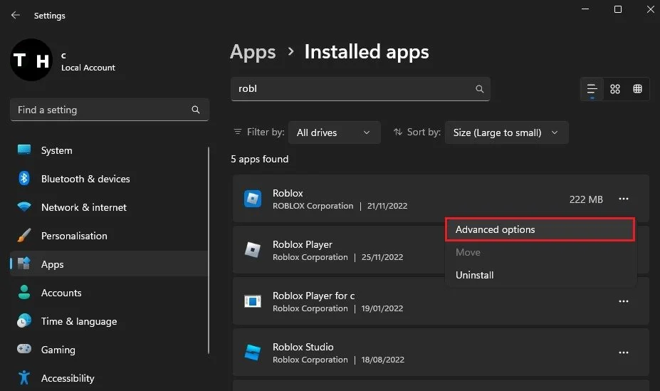 First, make sure Roblox is not running on your PC and open up your Windows settings. Navigate to the Apps section and under Installed apps, search for Roblox. Click on the three dots on the right-hand side and select Advanced Options.