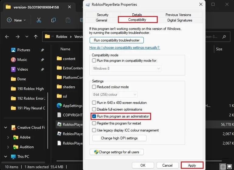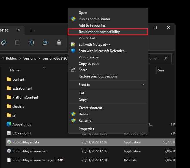 Next, right-click the application again and select Troubleshoot compatibility. The compatibility troubleshooter will open up, and then select Try recommended settings. Finally, you can test if Roblox will launch without getting the error on startup.