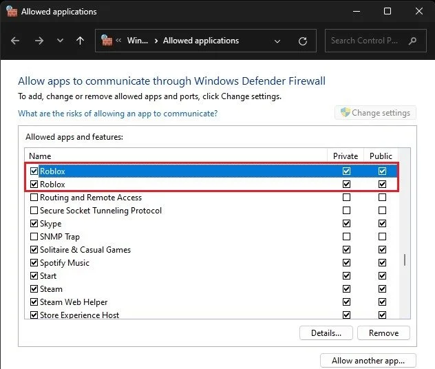 On this window, click on Change settings, look up Roblox, and ensure that these checkboxes are checked before closing this window.