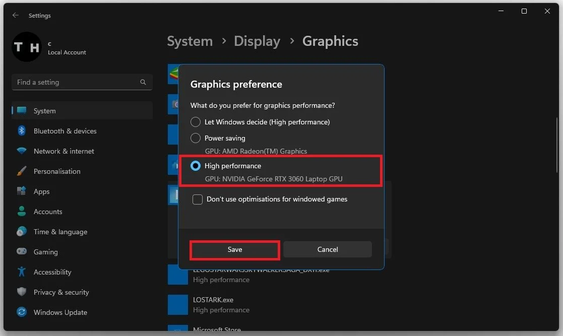This will add the Fortnite application to the list of apps below. Click on Options for Fortnite, and then set the Graphics Preference to High Performance.
