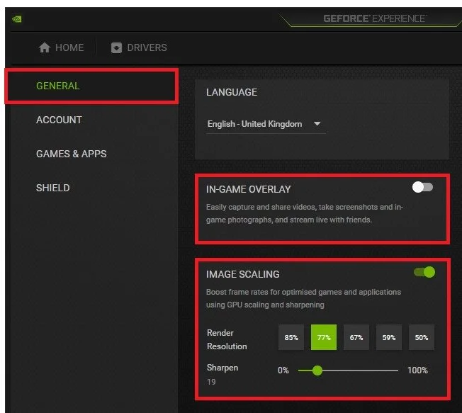 Lastly, we will take a look at your GeForce Experience settings. In the General section, make sure that the In-Game Overlay is disabled. Overlays are known culprits for lag and fps drops. Below, enable the NVIDIA Image Scaling option. This will in any case improve your gaming performance by increasing the image sharpness of your game. It allows you to reduce your video resolution and still get a great visual experience.