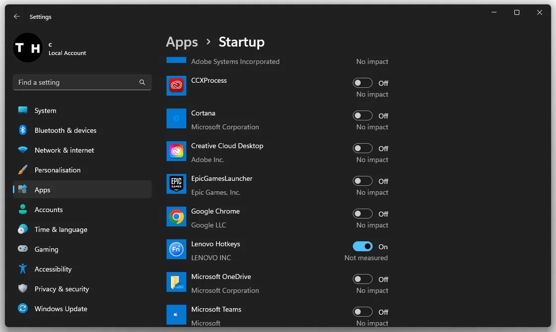 In your Apps settings, navigate to Startup, and here you should disable applications starting up that you don’t use daily. In my case, these include Steam or Discord.