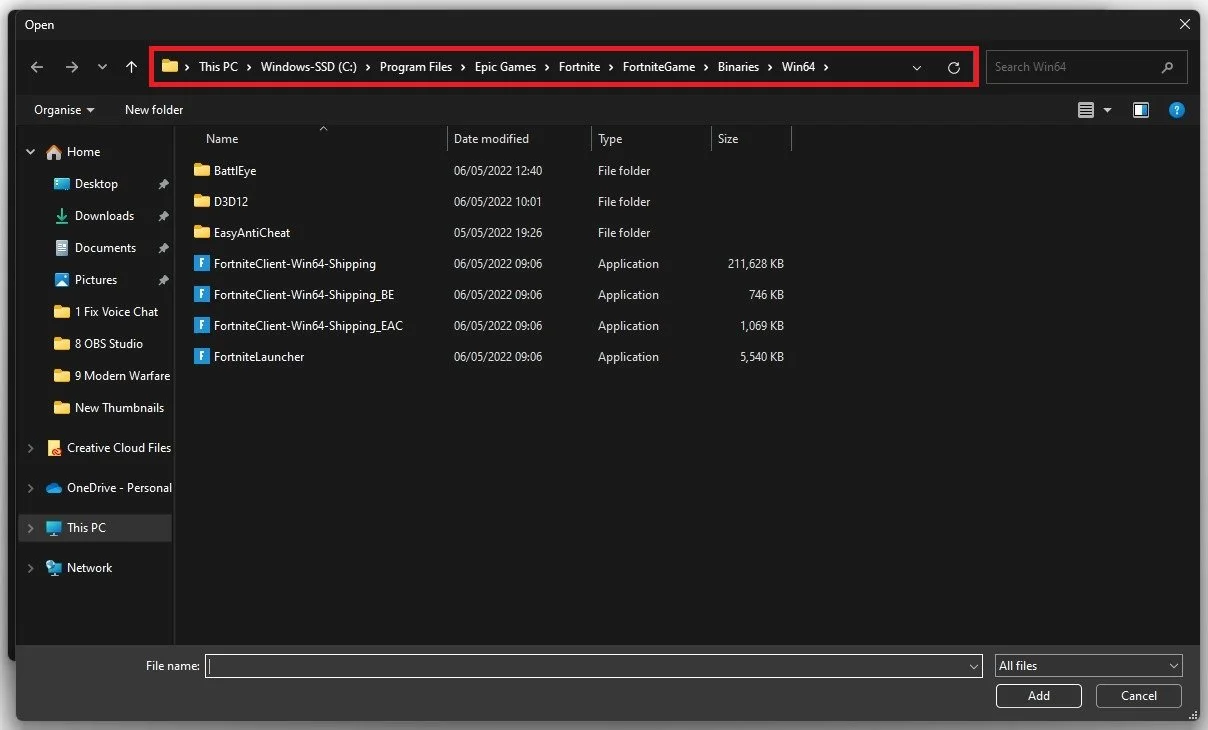From here, you will have to locate the Fortnite.exe application. The file path for my install location is Program Files > Epic Games > Fortnite > FortniteGame > Binaries > Win64. Select the FortniteClient-Win64-Shipping application with the biggest file size and click on Add.