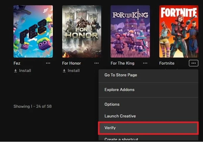 Epic Games Library > Fortnite > Verify