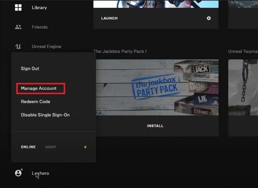 If that is the case, and you’re still getting the error message, then close Fortnite and open up the Epic Games launcher. Select your name and click on Manage Account.