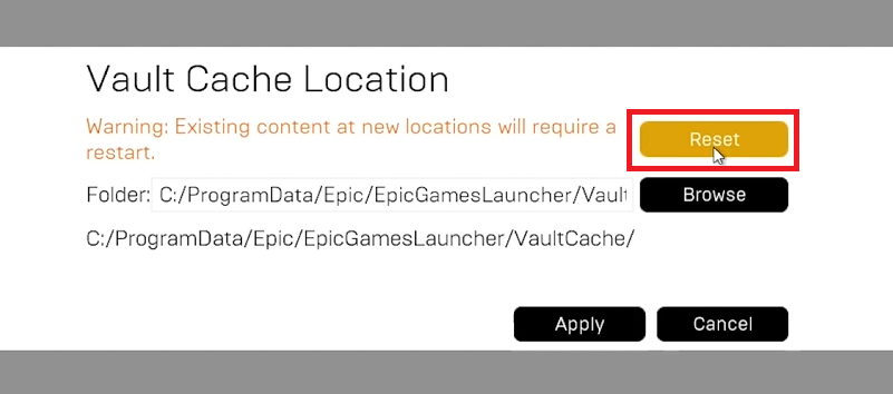 Reset Vault Cache: Click 'Reset' next to the Vault Cache option to refresh the folder location.