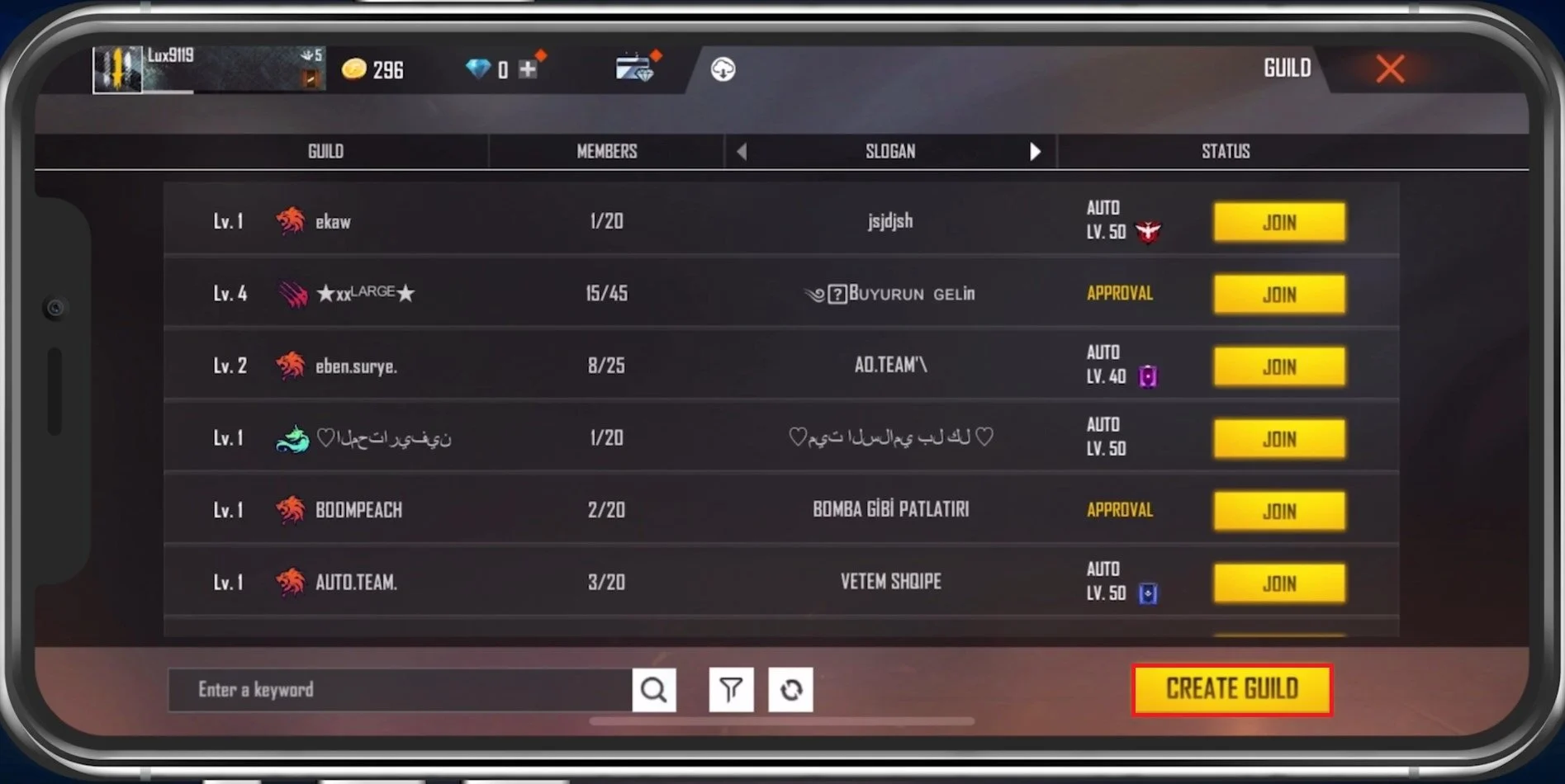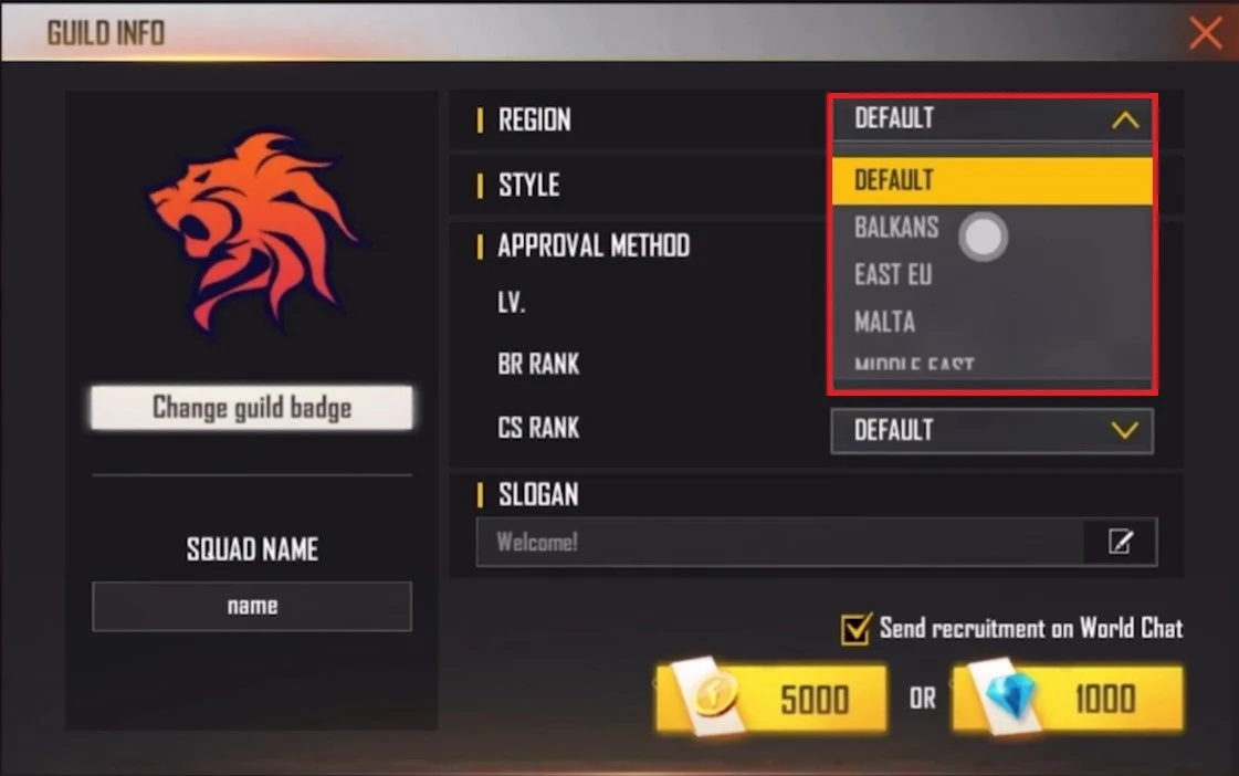 You can change the Guild Region, which can be set to a country of your choice. Change the Style you wish to play with users in your new guild. When using the Auto approval method, any user with the required Level, Battle Royale, and Clash Squad rank can join your new guild. When using the Approval method, you must manually accept or reject new potential members. Lastly, set a new slogan for your guild before paying the price to create the guild.