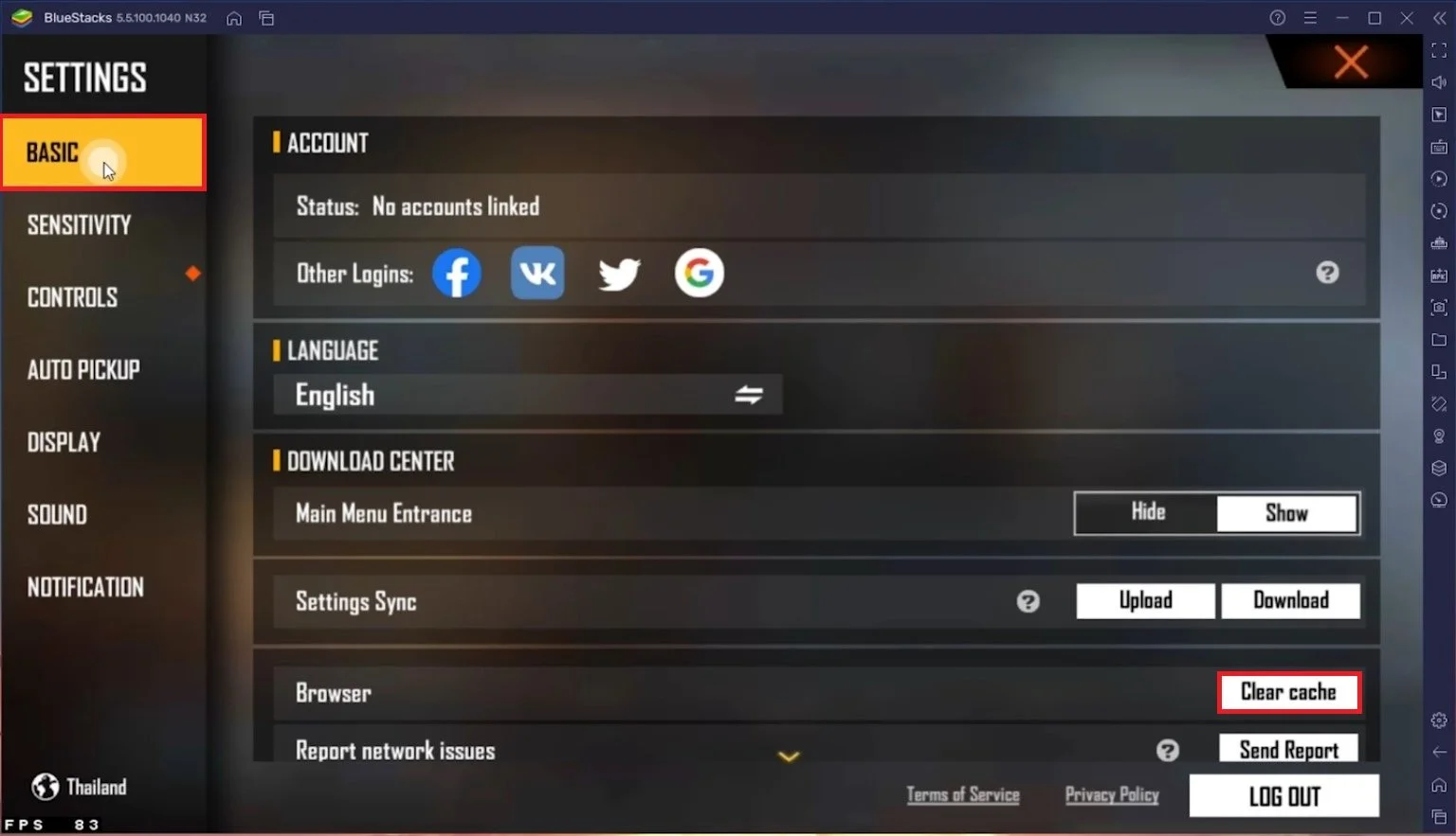 Open Free Fire and navigate to your settings by tapping the gear icon on the top right of your screen. In the Basic tab, select Clear the Browser Cache. This will be done immediately and can in a lot of cases fix the matchmaking error you are getting.