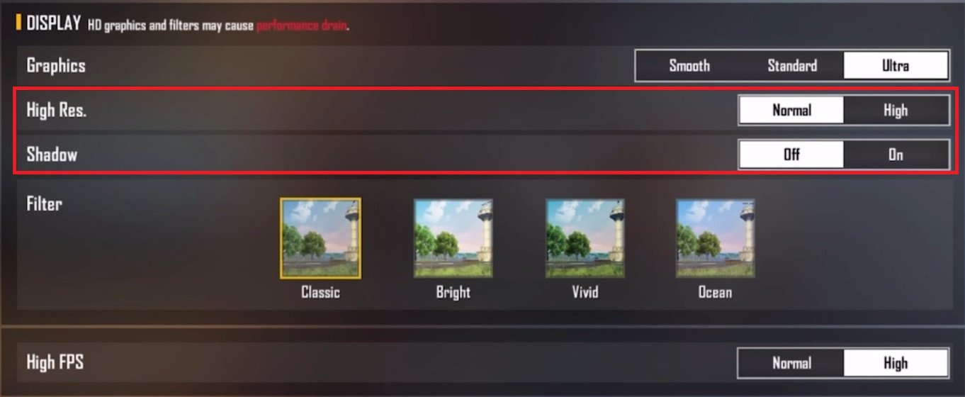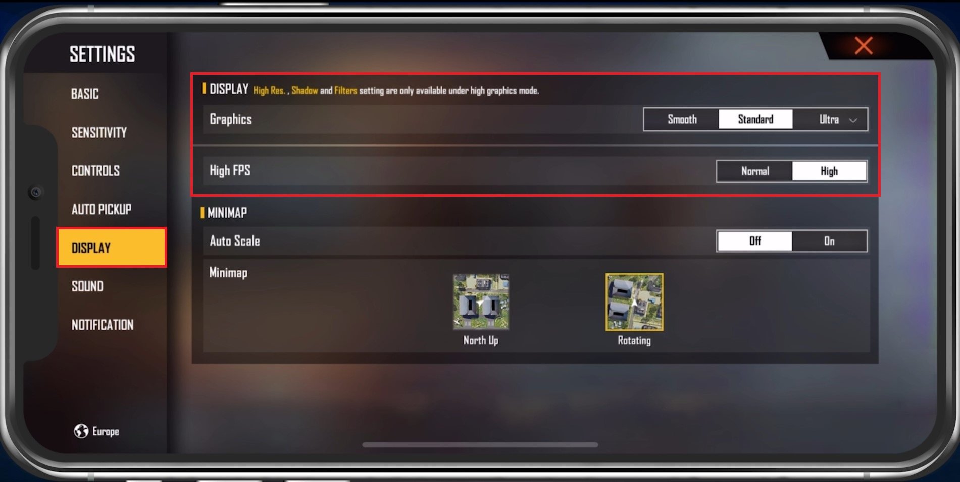 When using the Ultra option, you can use some additional settings which will further induce lag and FPS drops. We will set this option to Standard on an iPhone 11 Pro Max, but for any older or less powerful device, make sure to use Smooth. Enable the High FPS option. This will allow the game to maximize the FPS value according to your screen refresh rate. The Minimap options below will not impact the game’s performance, so set this option according to your preference.
