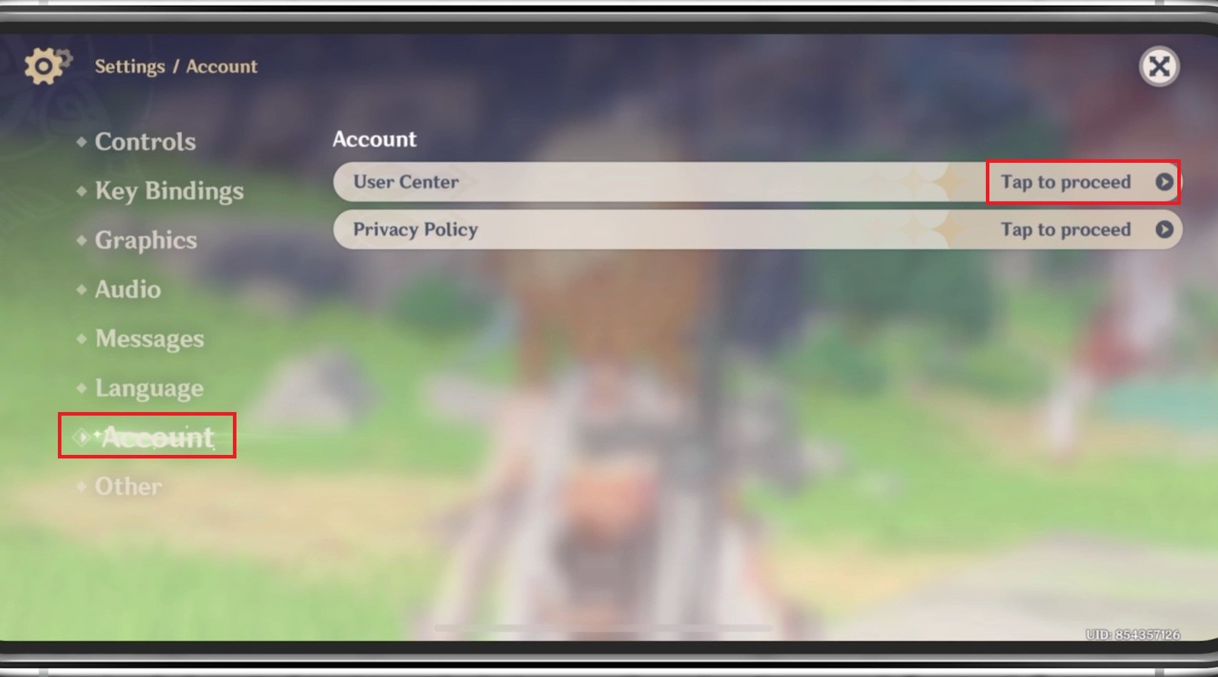 Launch Genshin Impact and navigate to your in-game settings. In the Account section, tap to proceed to your User Center.