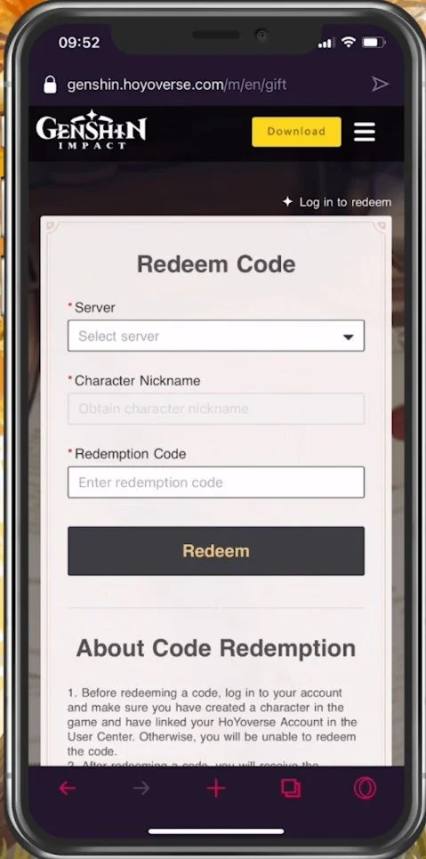 For some users, this Redeem Code option is not available. You must redeem the codes using your favorite browser if this option is unavailable. Navigate to genshin.hoyoverse.com. Select your current Server Location, enter the correct Character Nickname, and then enter the Redemption code. To ensure that the correct account gets the items, you should also make sure that you are logged in with your Genshin Impact account.