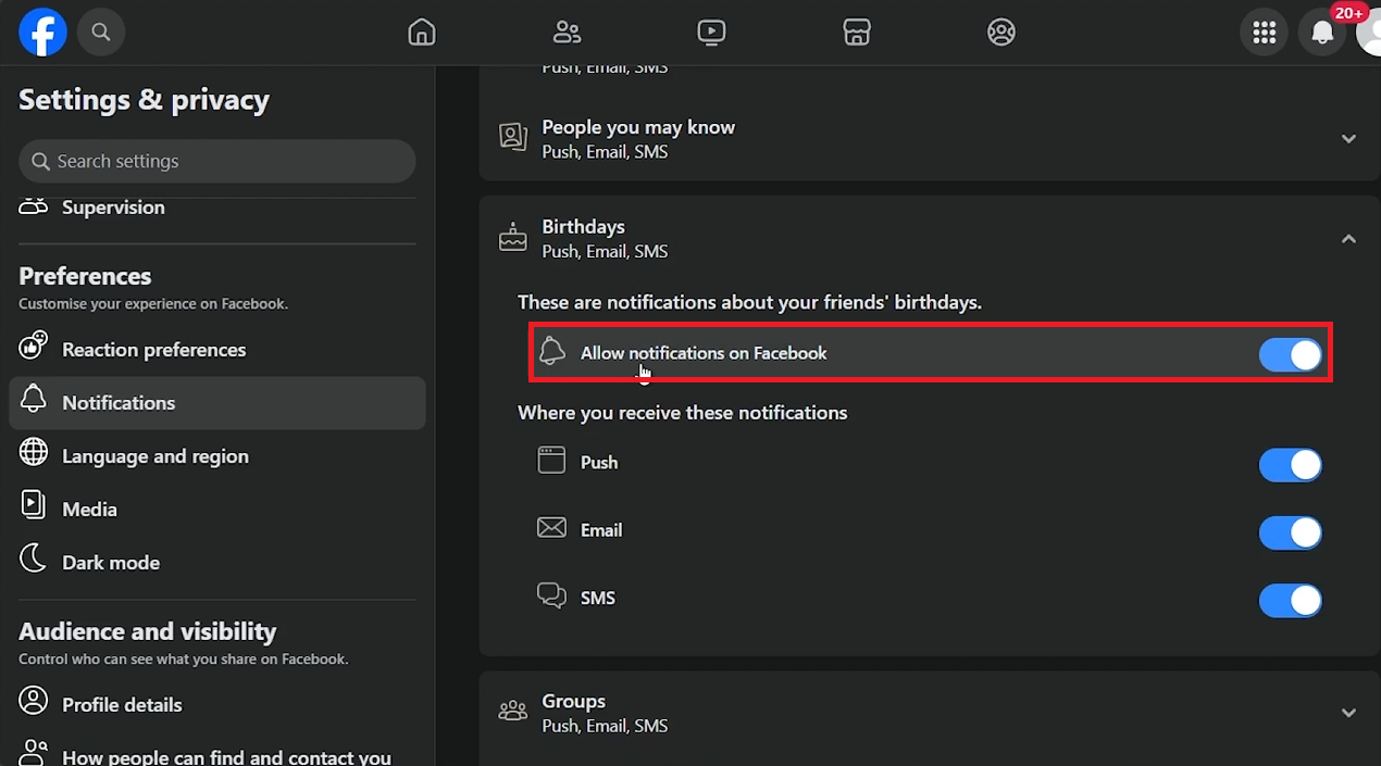 Allow notifications for birthdays on Facebook