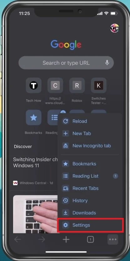 On your mobile device, open up the Chrome app. On the bottom right of your screen, tap on the burger menu and select Settings.