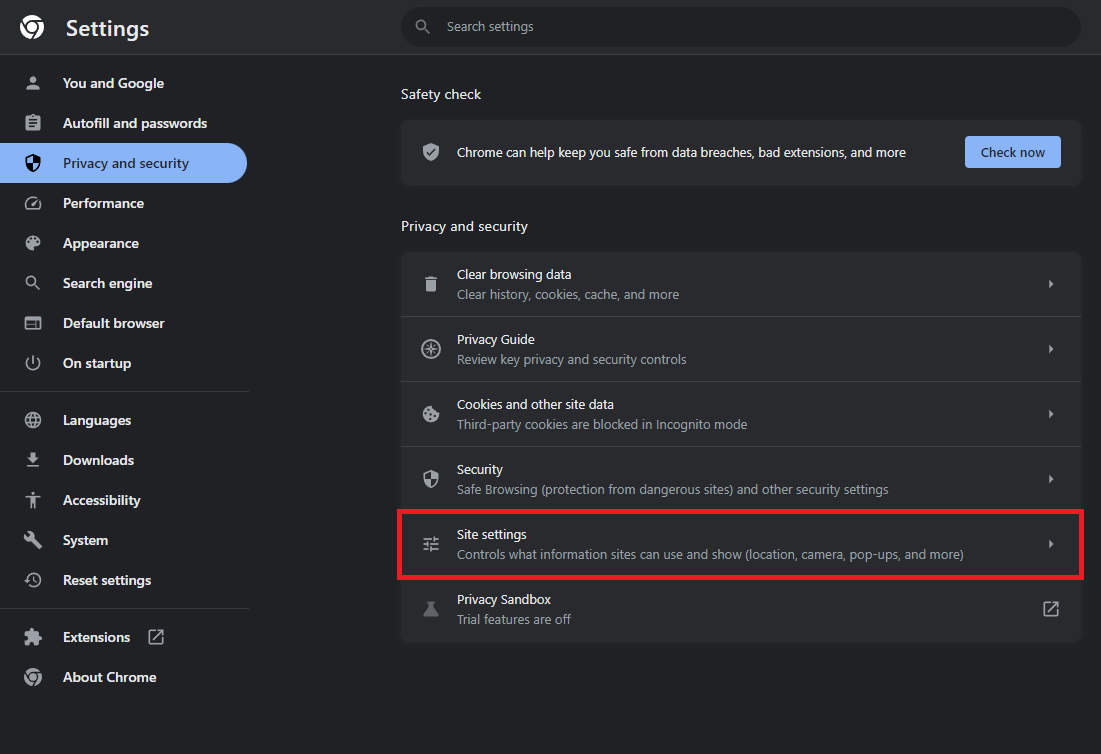 Find Site Settings: Under "Privacy and Security," navigate to the "Site Settings" section.