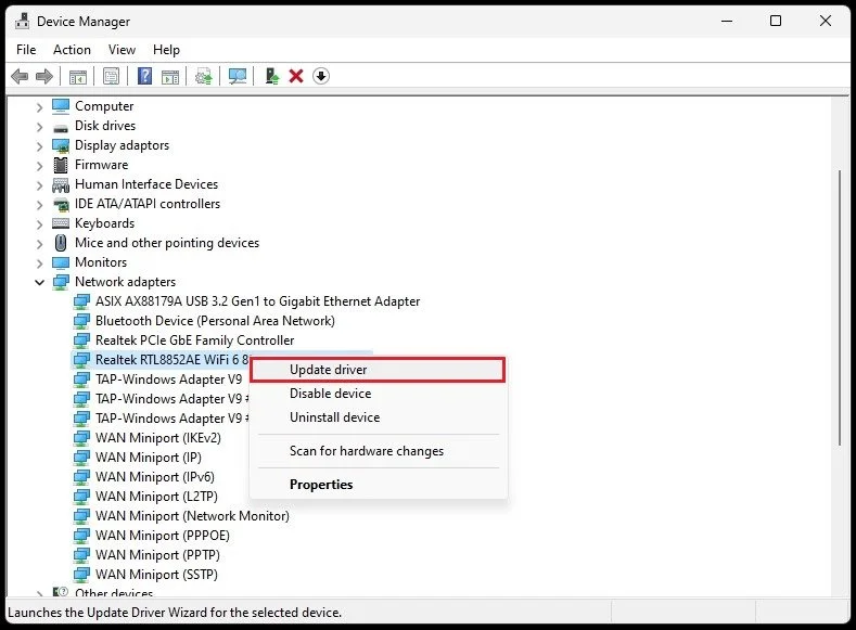 In case nothing helped you out, then make sure to update your network drivers. Open up your Device Manager application. On this window, expand your Network Adapters, right-click the one you are using and select Update Driver. On this window, select Search automatically for drivers. If unsure which network adapter you are using, repeat this step with each in this list of devices.
