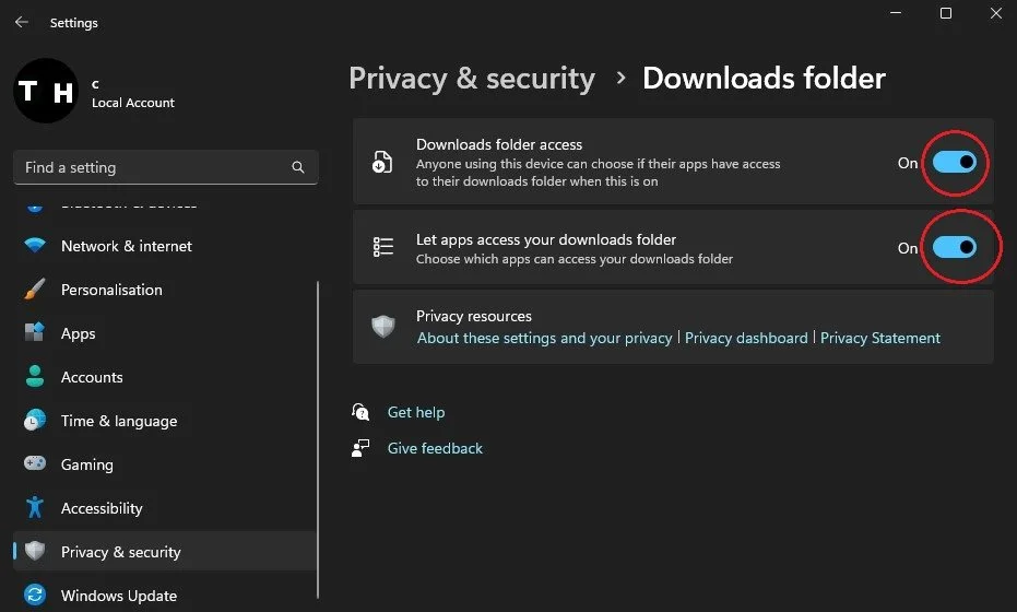 Next, navigate to the Privacy & security section while in your settings. Here, scroll down and click on Downloads folder. Ensure that the Downloads folder access and Let apps access your downloads folder options are enabled.