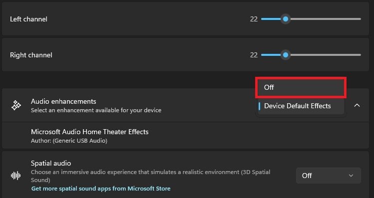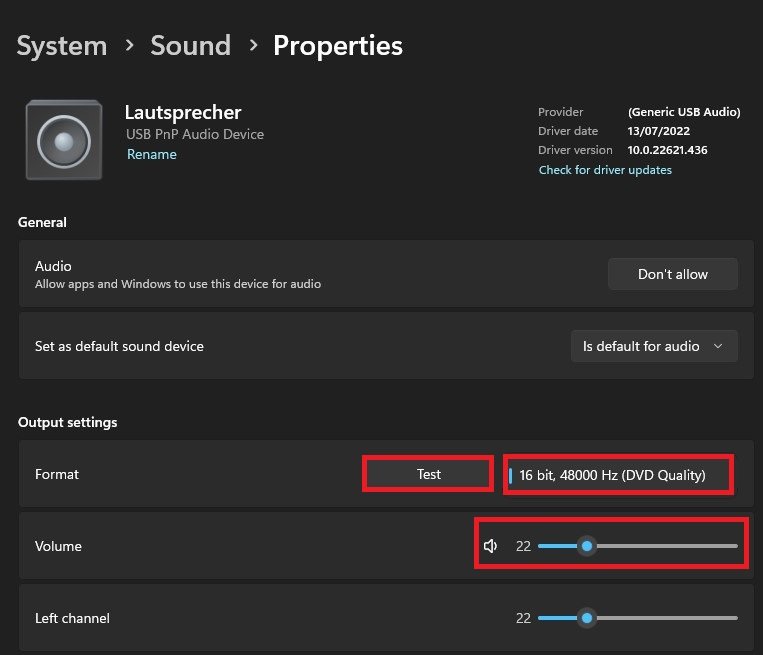 When clicking on it, you can adjust the volume sliders and change the audio format, which should be set to 48’000 or 44’100 Hz, whichever is higher and available.