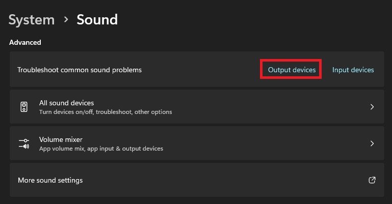Back in your Sound settings, scroll down, and click on Troubleshoot common sound problems for Output devices. It will take a moment to scan and apply some changes to settings to fix common sound issues. This can sometimes help fix sound issues for Windows and 3rd party applications.