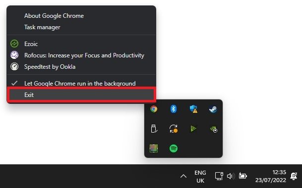 First, close your Chrome browser and prevent it from running in the background. Open your system tray, right-click the Google Chrome icon, and select Exit.